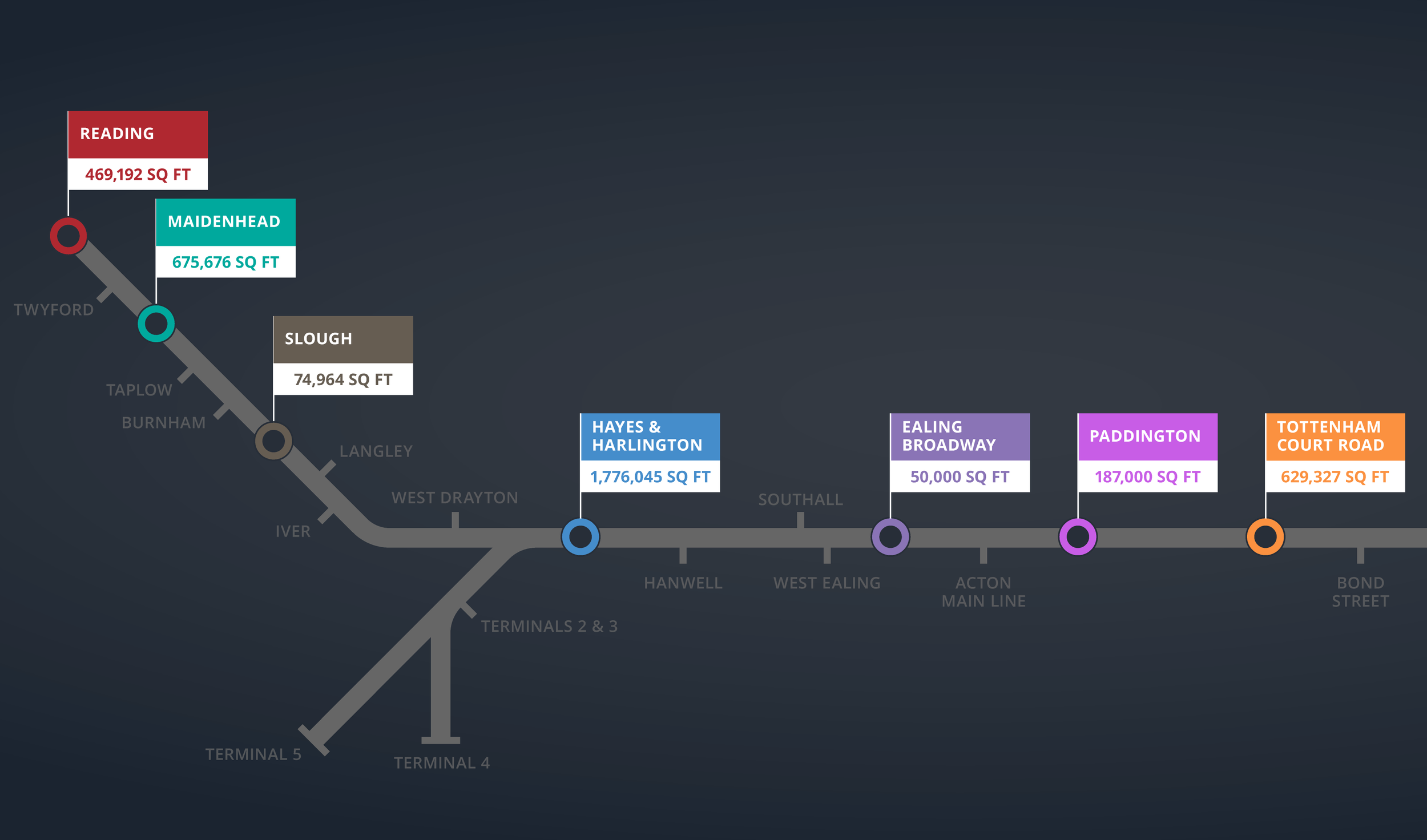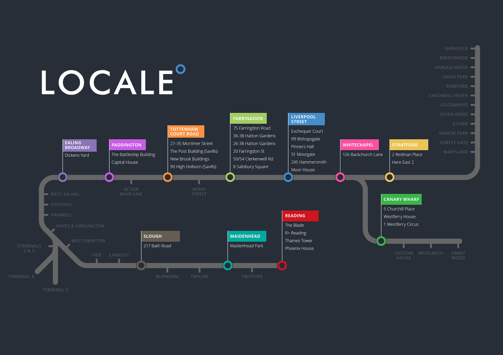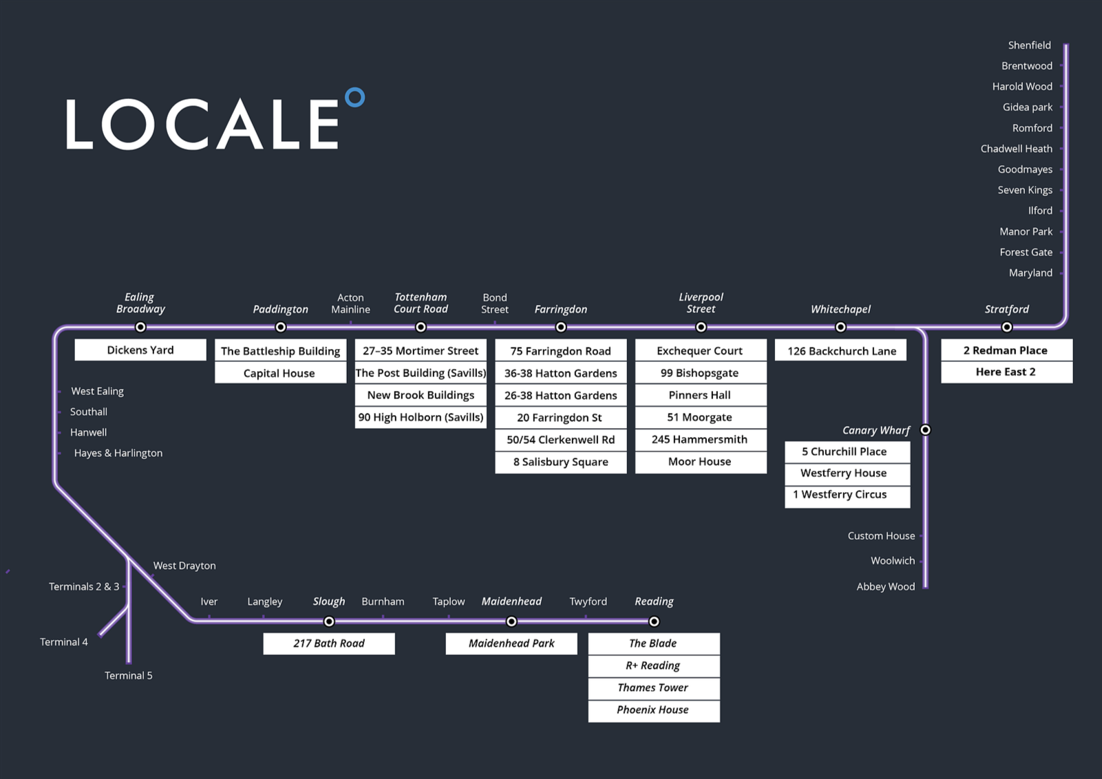 The result is a distinctive, branded visual that communicates exactly what Locale wanted — a snapshot of their property portfolio, showing both the locations and the scale of their holdings along the Elizabeth Line.